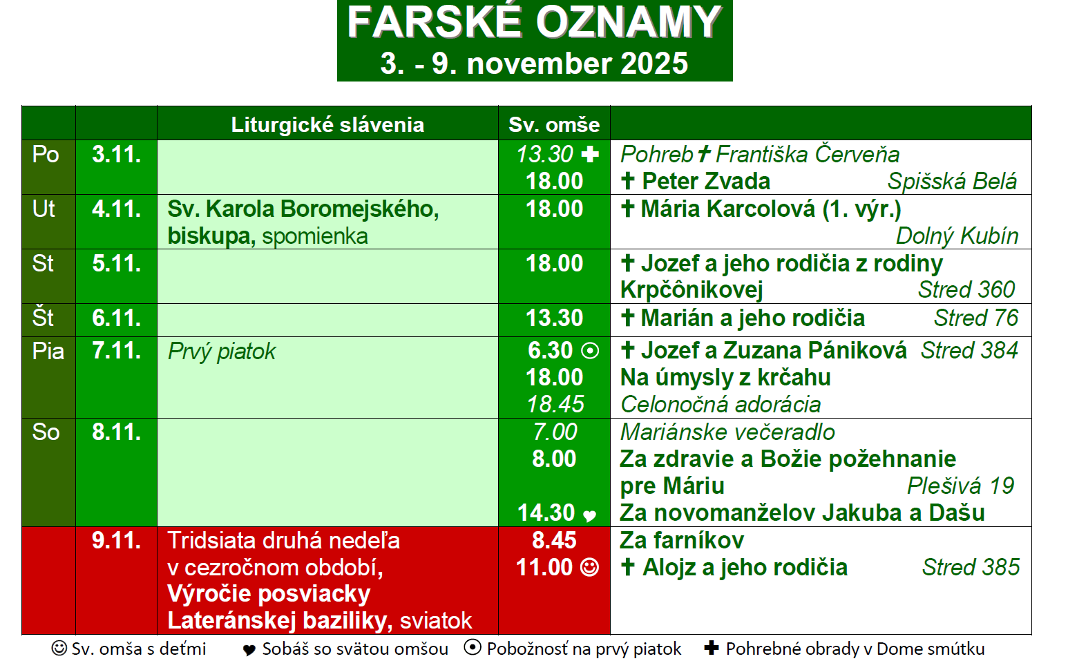 - Sviatosť zmierenia: Pondelok - štvrtok pol hodiny a v piatok hodinu pred sv. omšou.